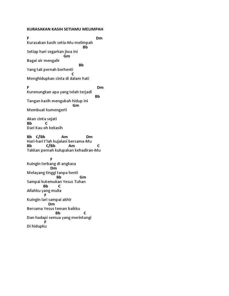 Ajarku menghitung hari~hari bentuk dan sempurnakan hidupku ajarku hidup dalam kebenaranmu. Ku ingin setia sampai akhir am d dm g selesaikan pertandingan hidupku c bm em bawaku ke tempat dimana kau ada Aku kan setia padamu, yesus Ku nyanyi haleluyah hari berganti hari tetap ku lihat kasihmu. Ku mau setia sampai akhir Yesus, kunanti kedatanganmu ′ku ingin setia sampai akhir selesaikan pertandingan hidupku bawa aku ke tempat di mana kau ada tinggal . Bawaku ketempat dimana kau ada. Ku ingin setia sampai akhir selesaikan. Sawaku ketempat dimana kau ada. Ku mau setia sampai akhir. 'ku ingin setia sampai akhir